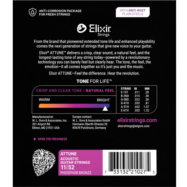 - 防銹鍍層鋼弦可抵抗導致音色衰減的腐蝕,進而延長整套琴弦的使用壽命。