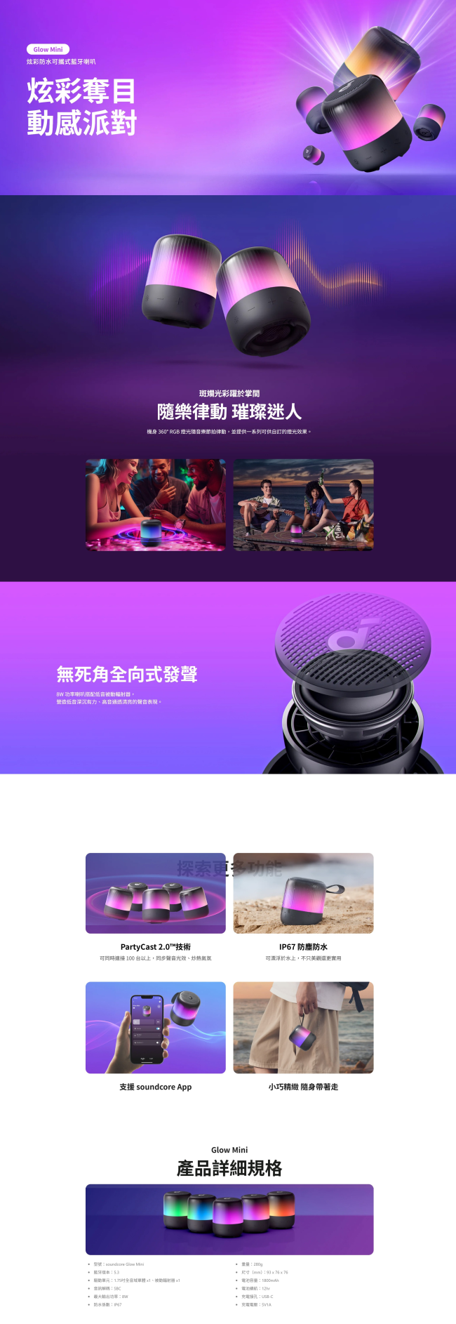 Soundcore Glow Mini 炫彩防水可攜式藍牙喇叭/炫彩奪目/動感...
