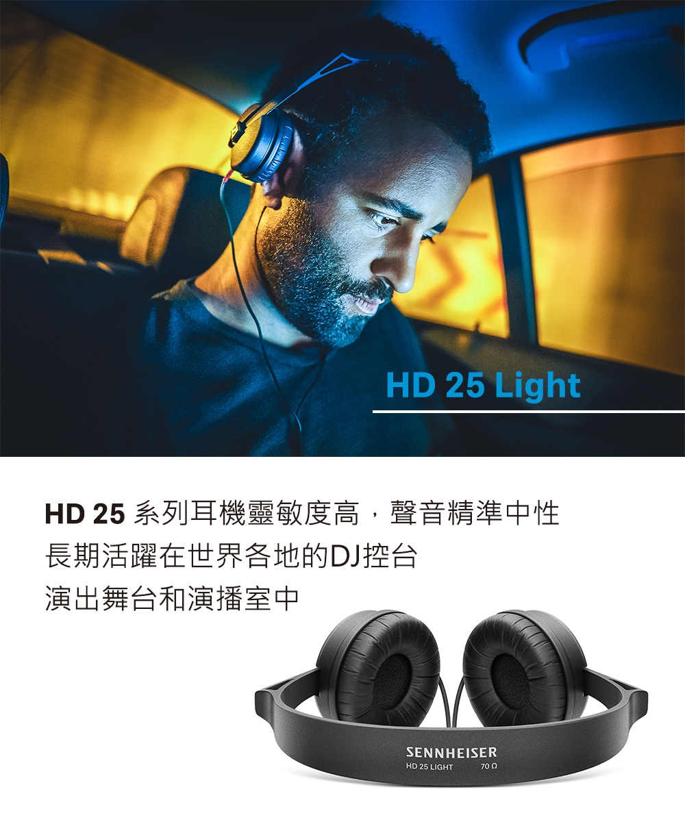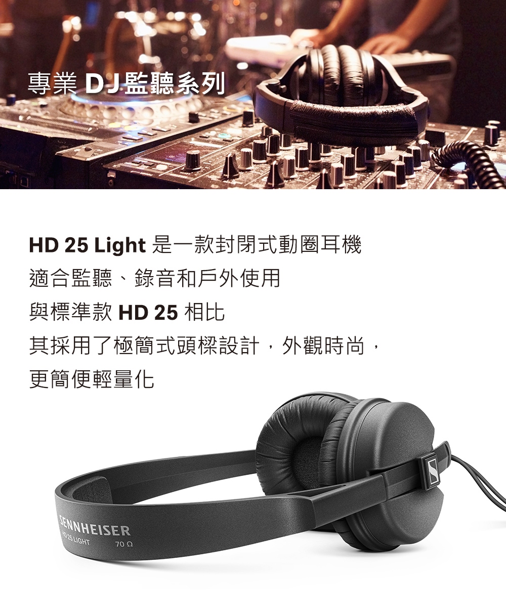Sennheiser HD 25 Light 輕量經典款/專業耳罩式監聽耳機 HD25 Light 台灣公司貨保固,HD 25 Light 是一款封閉式動圈耳機,適合監聽、錄音和戶外使用,與經典款 HD 25 相比,HD 25 Light 耳機採用了極簡式頭樑設計,外觀時尚,輕量化更簡便。為 DJ 使用提供了優良的佩戴舒適性。